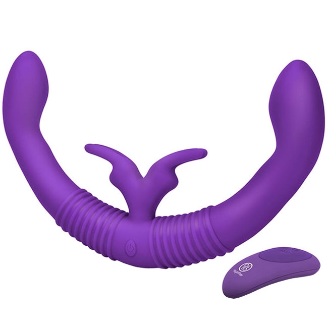 Необыкновенный двойной вибростимулятор фиолетового цвета с дистанционным пультом управления.